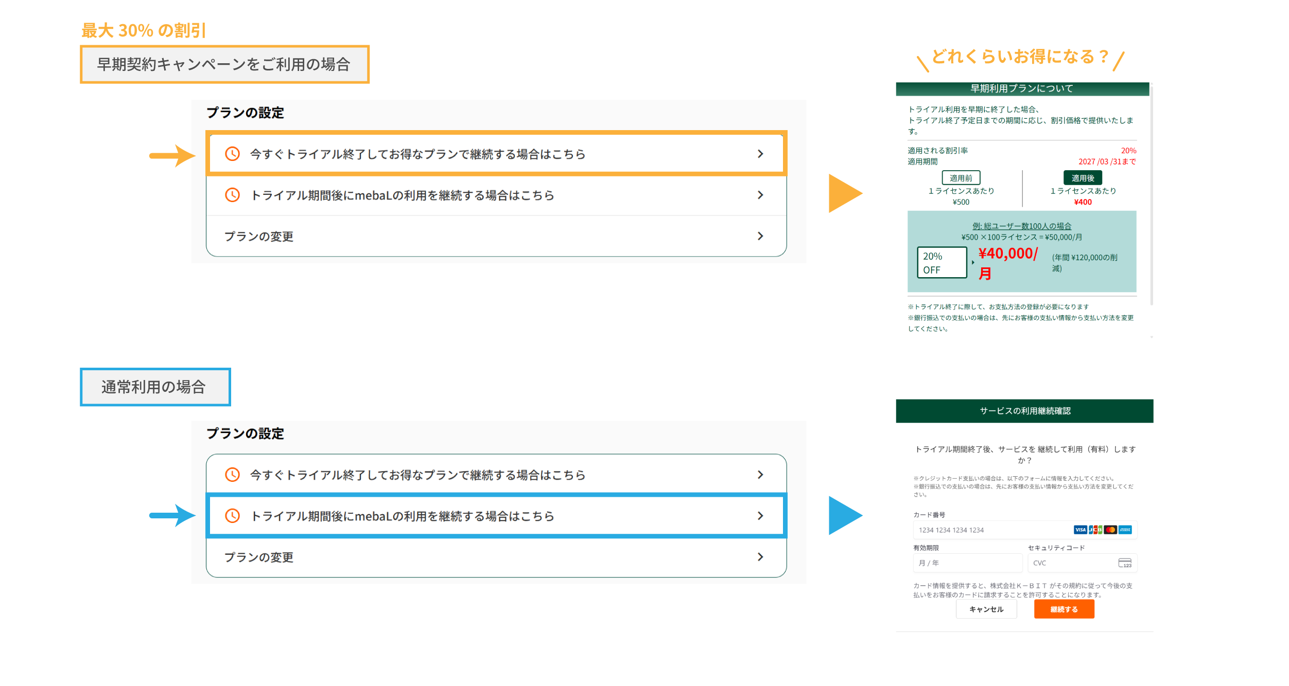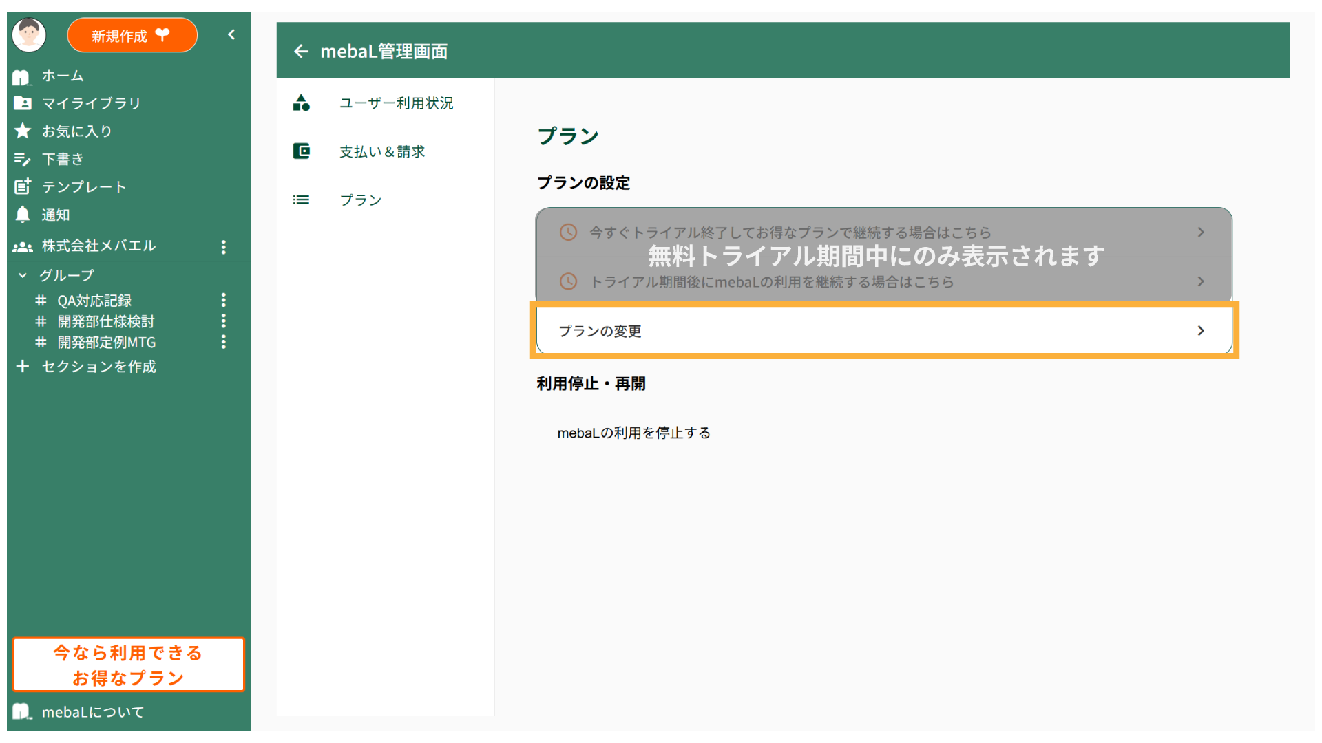 4.プラン画面に戻り、 [トライアル期間後にmebaLの利用を継続する場合はこちら]をクリックします。