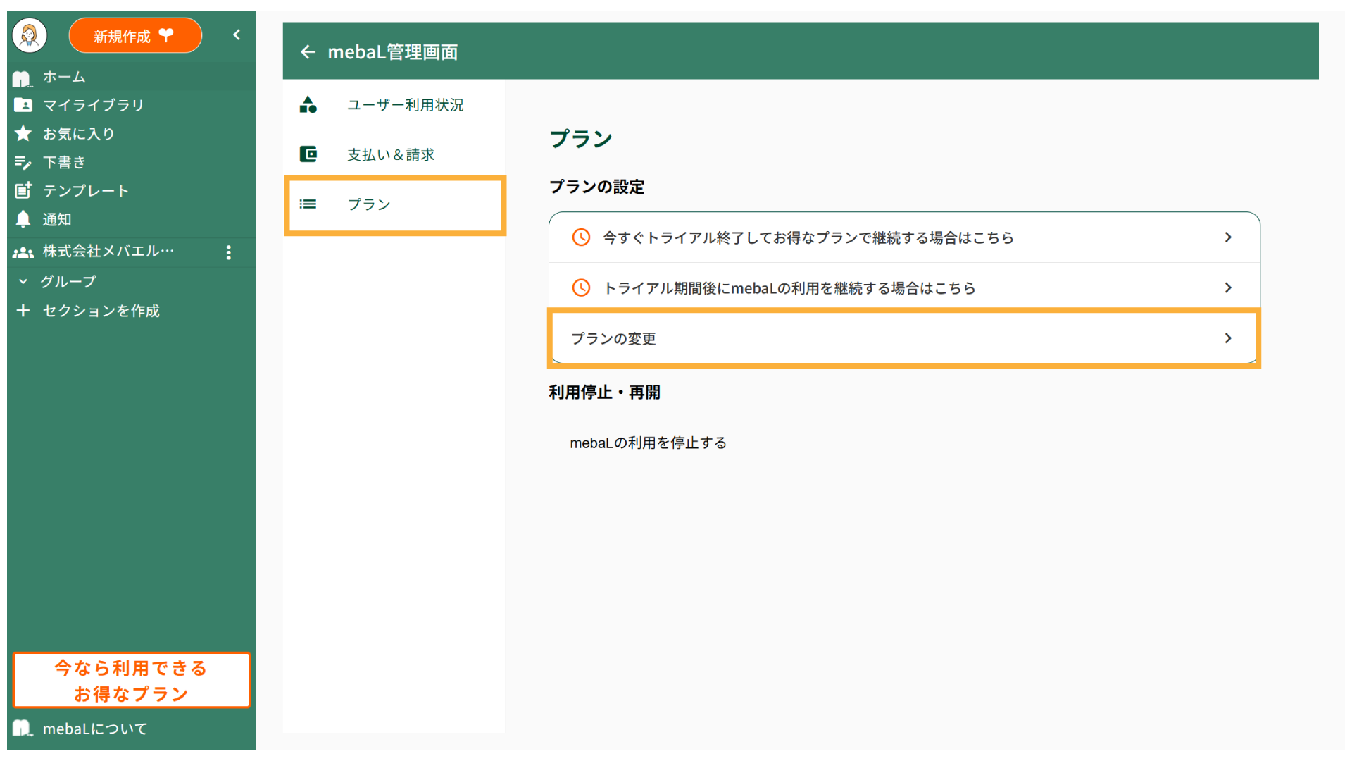 3.[プラン] > [プランの変更]からご利用になるプランを選択します。