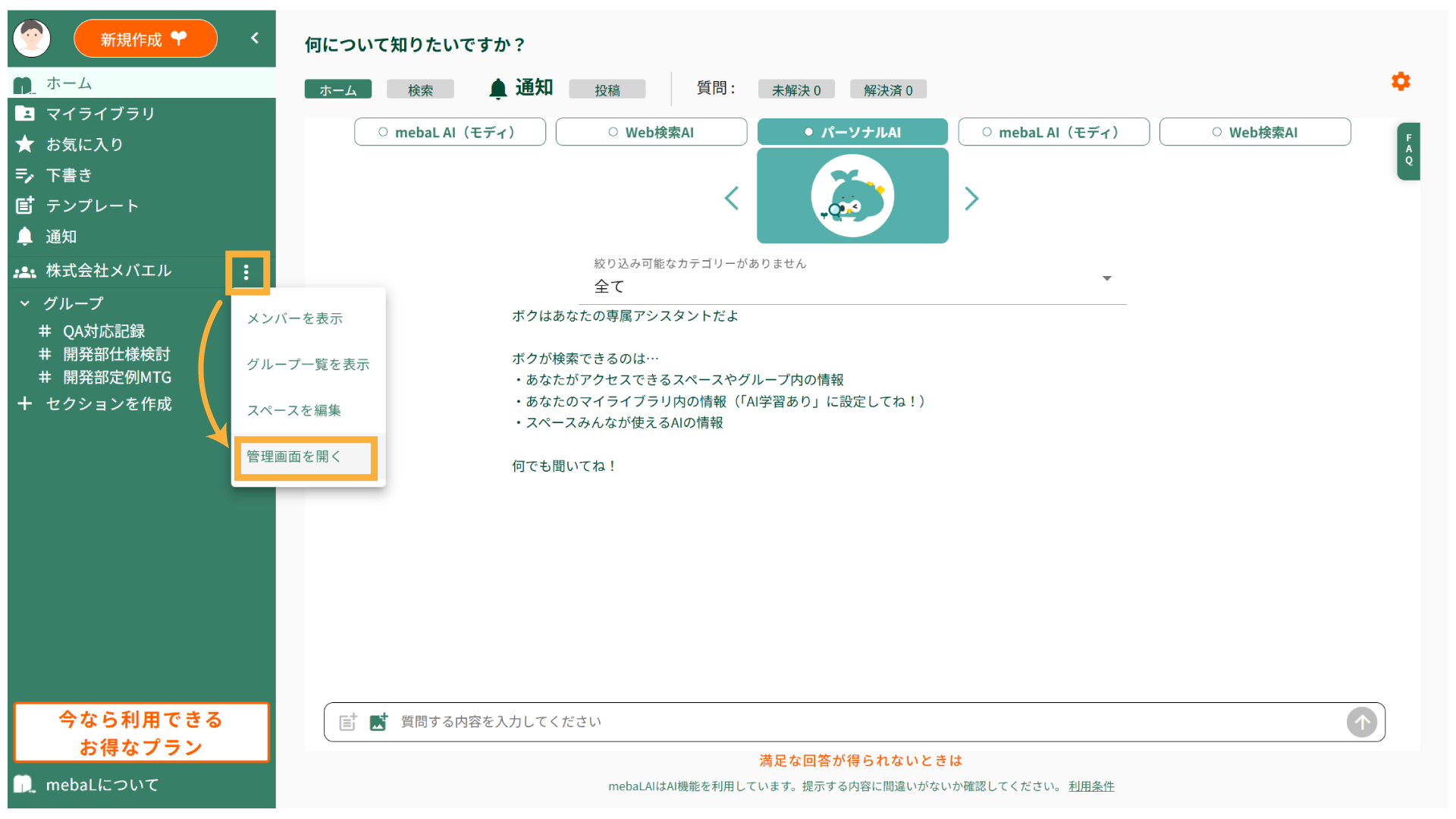 1.スペースの設定「︙」 > [管理画面を開く]をクリックします。
