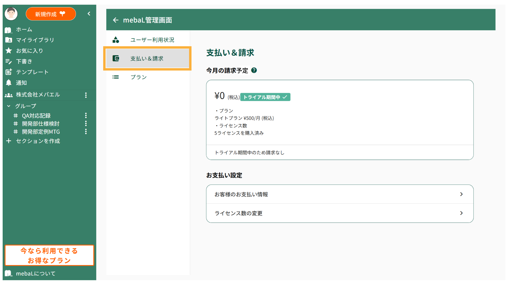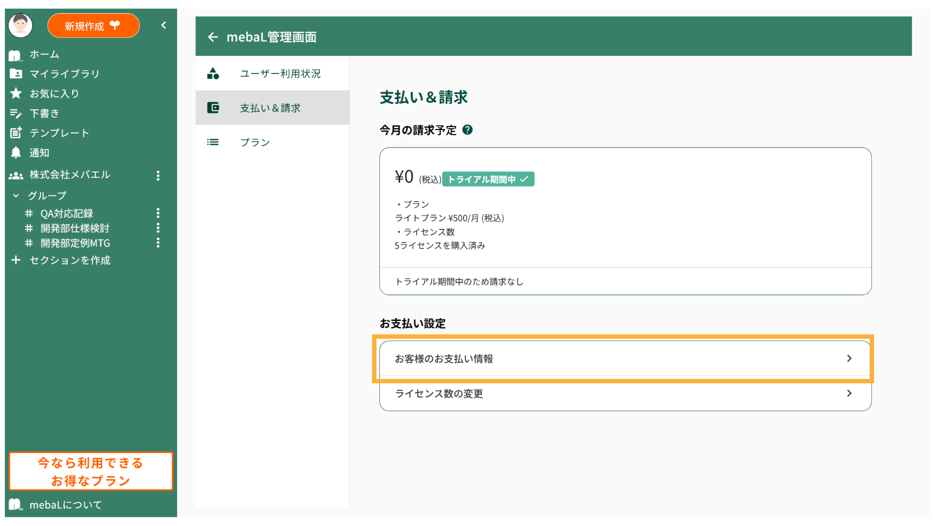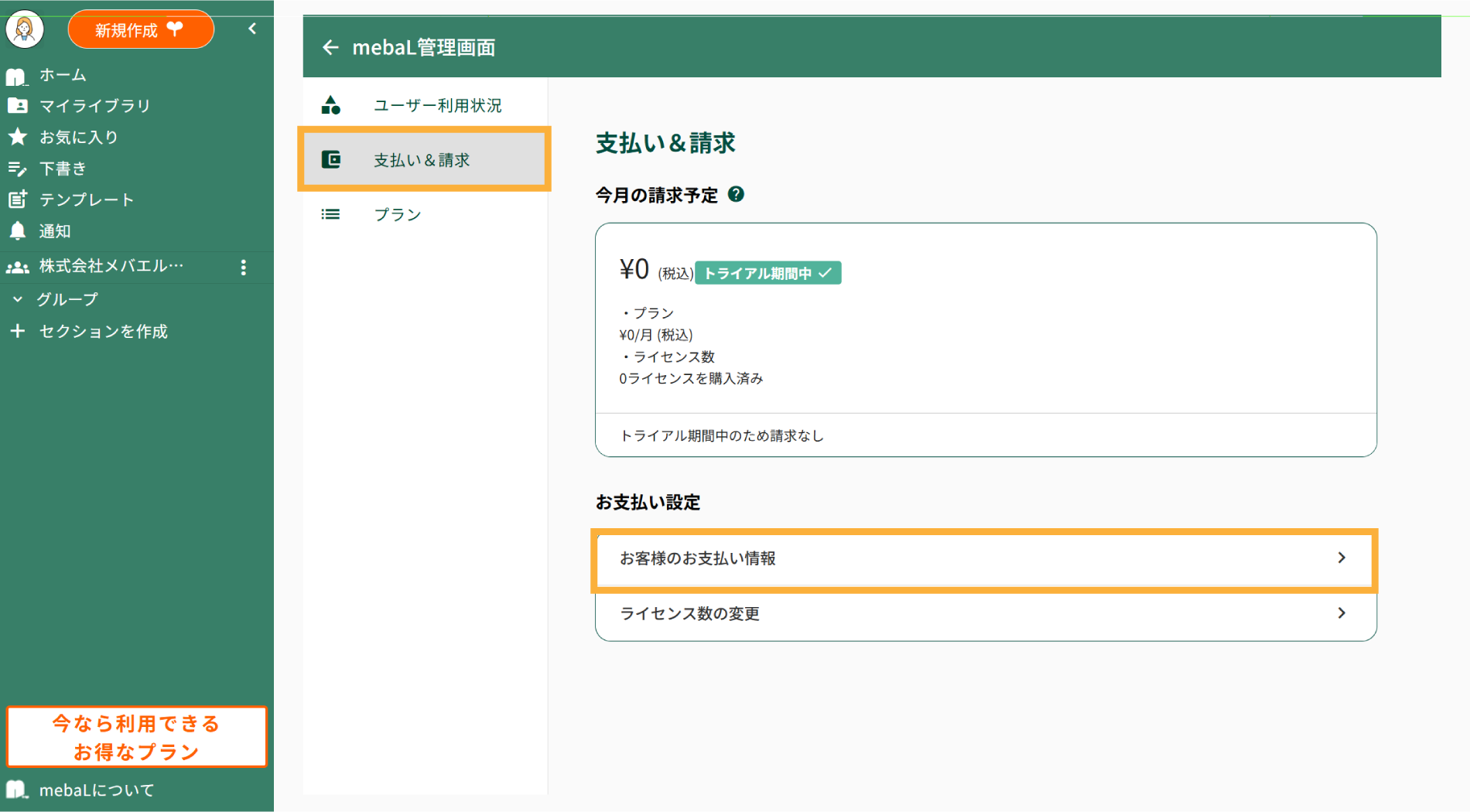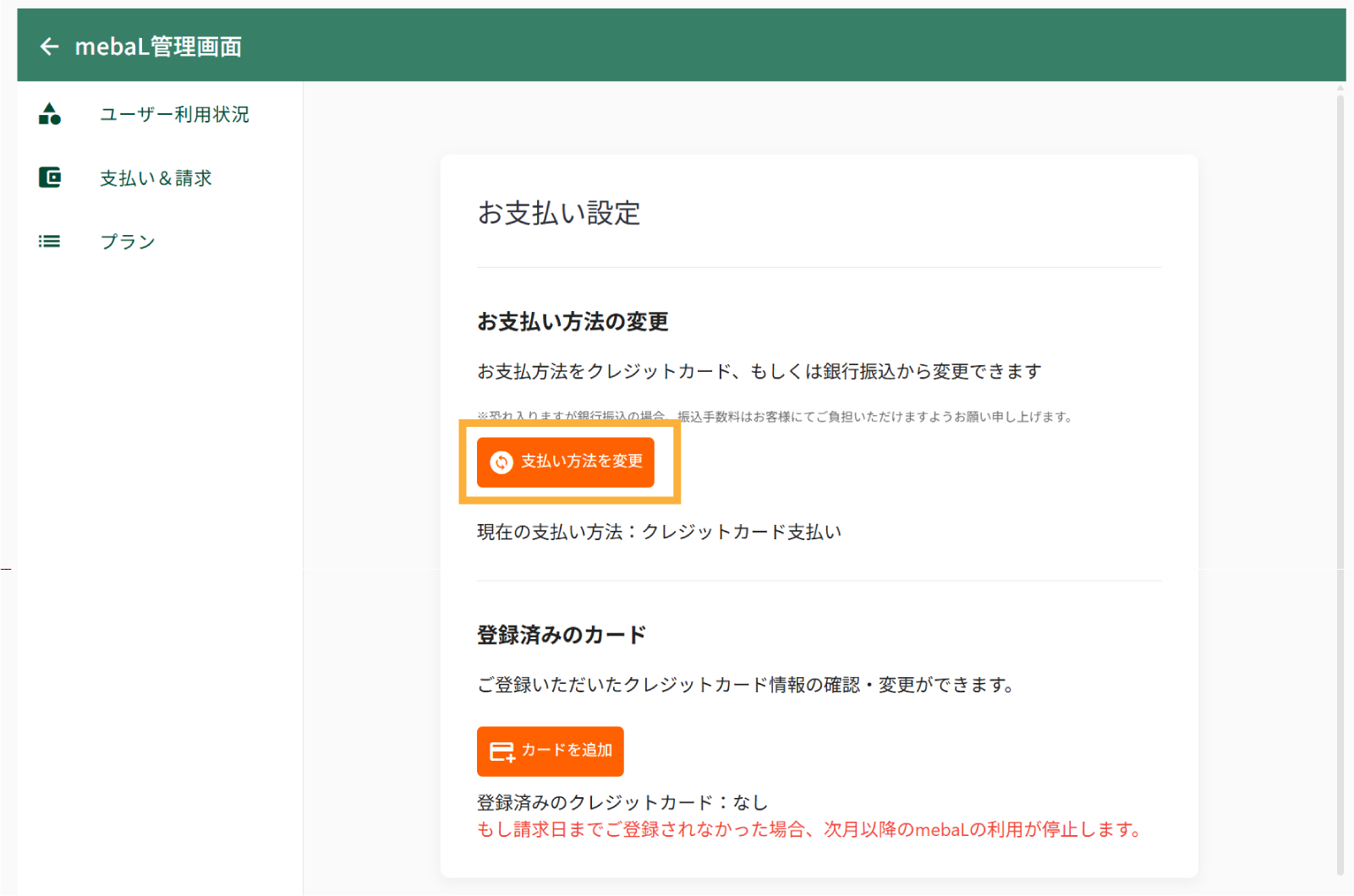 無料トライアル終了後、継続してmebaLをご利用いただく場合は、お支払い情報の登録が必要となります。