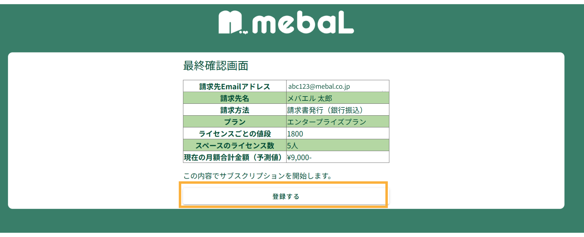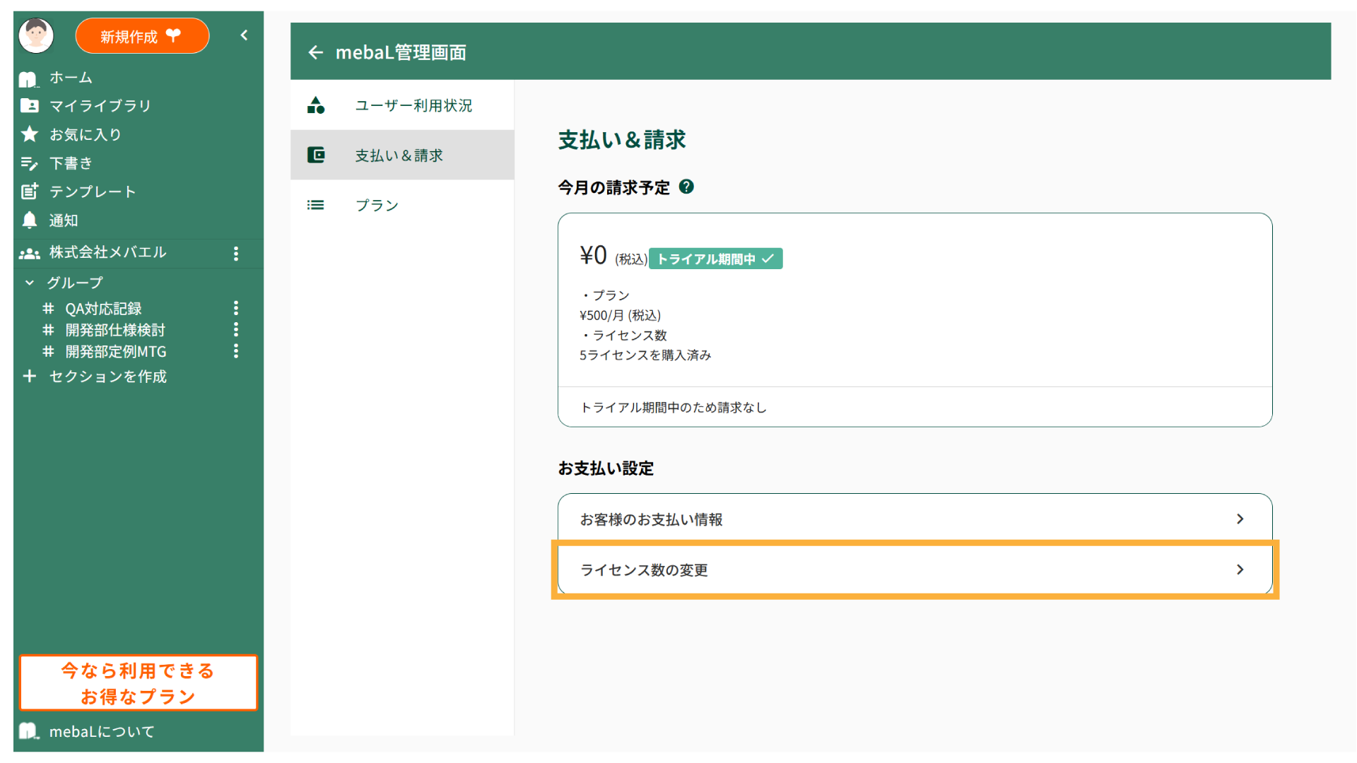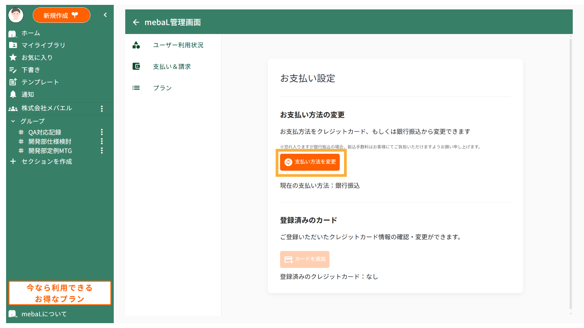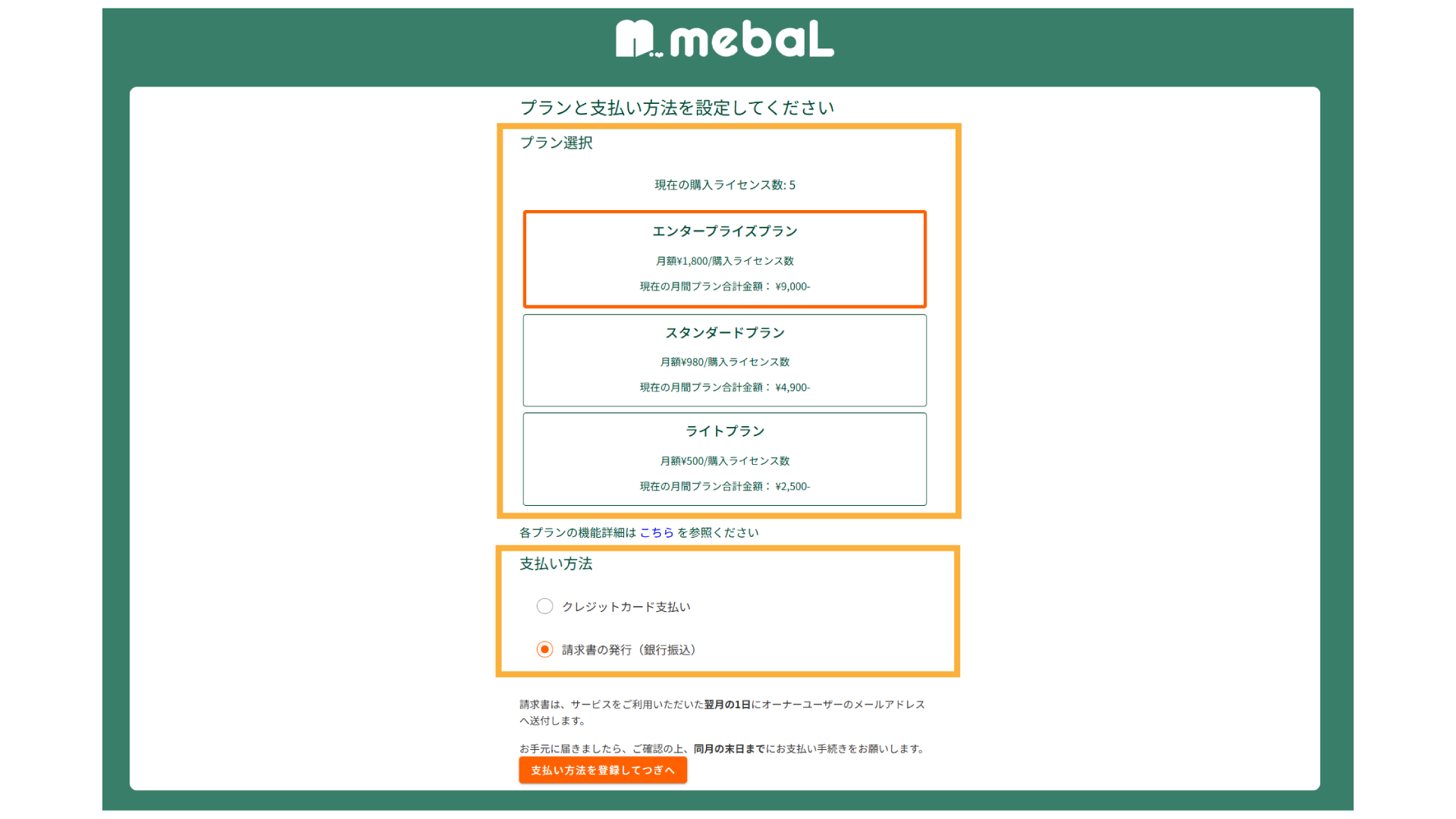 無料トライアル終了後、継続してmebaLをご利用いただく場合は、お支払い情報の登録が必要となります。