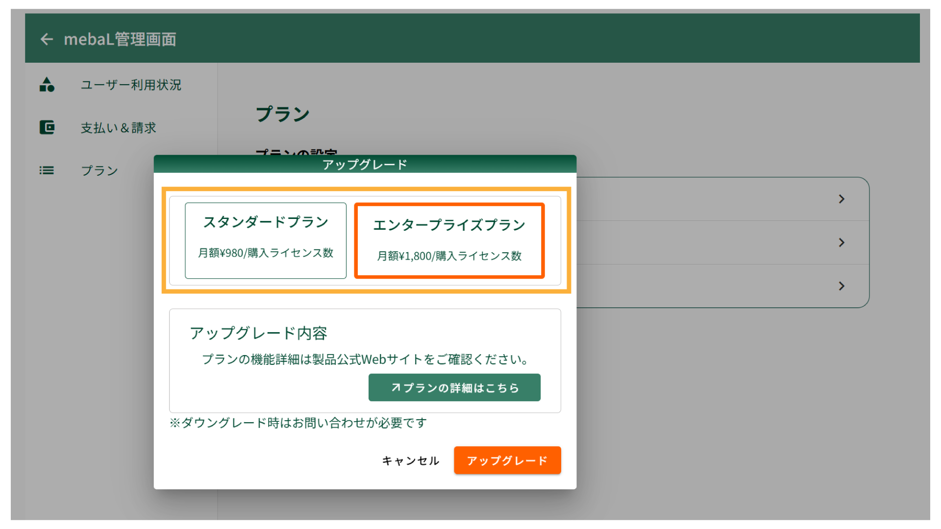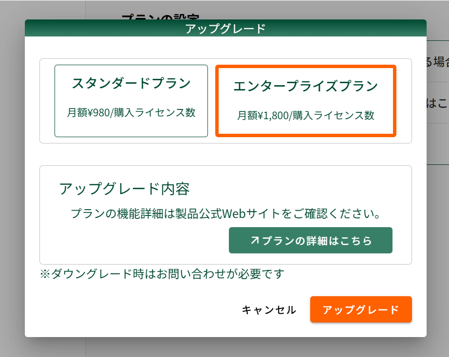 プラン変更については、原則アップグレードのみに対応しております。