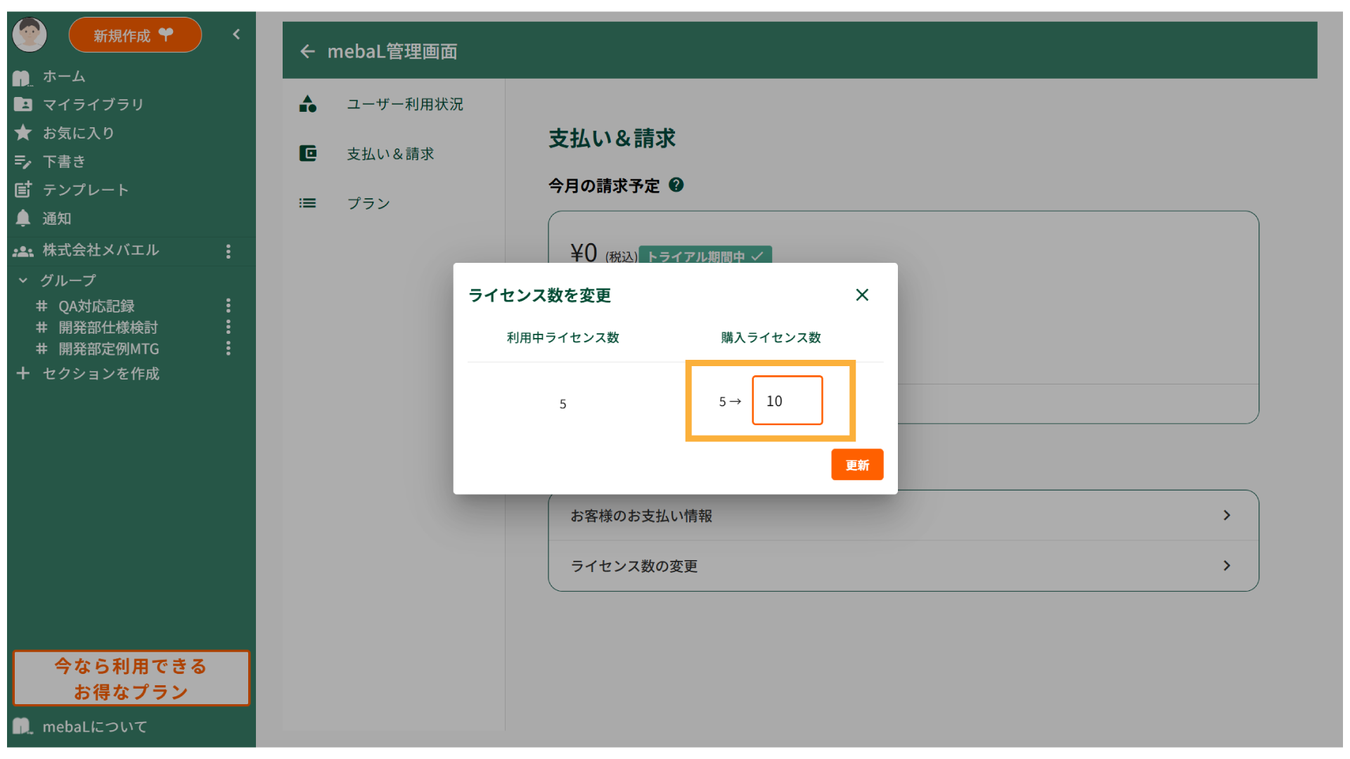 4.購入するライセンス数を入力し、[更新]をクリックします。