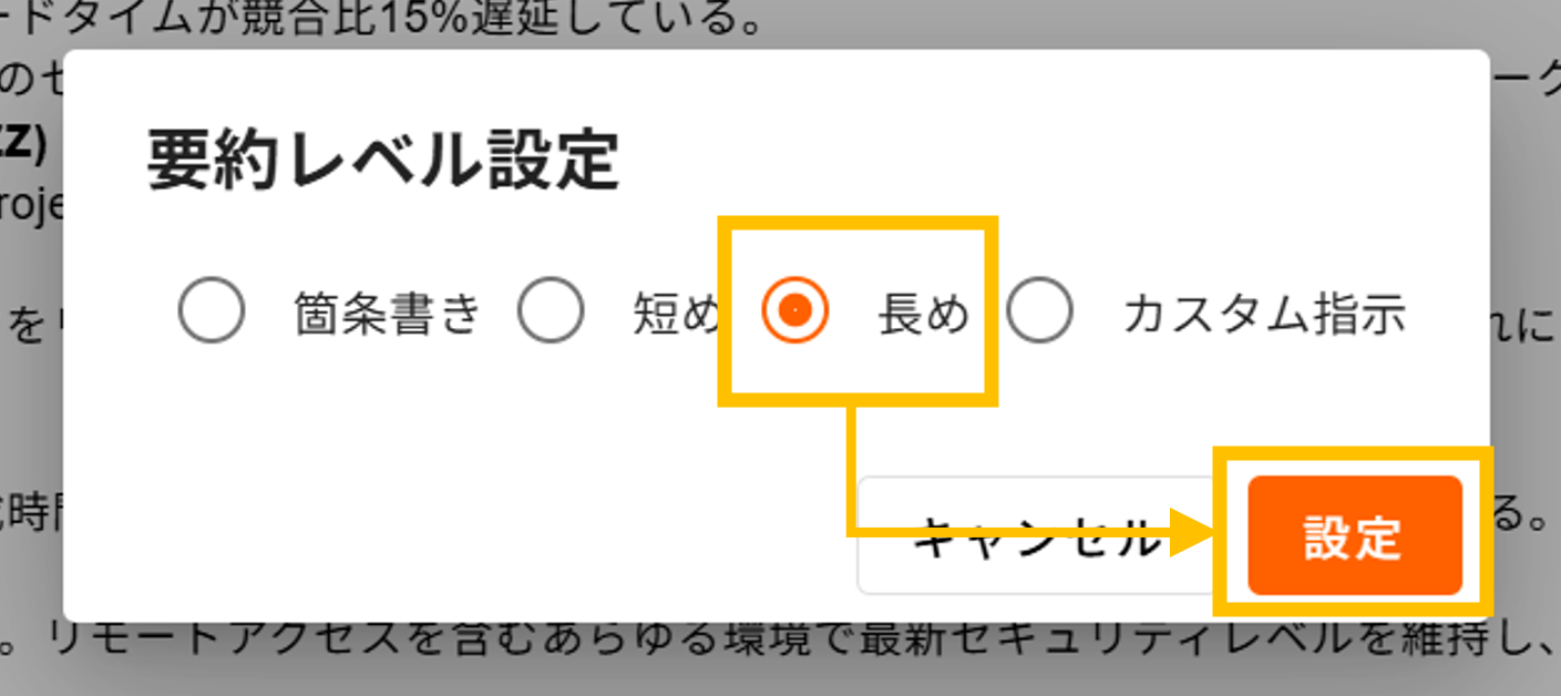4.要約レベル設定画面が表示され、要約したいスタイルを選択し[設定]をクリックします。