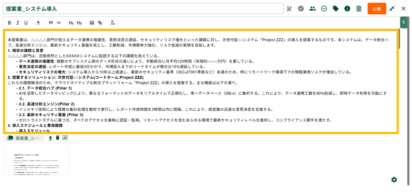 ・本文エディタ:アップロードしたファイル内容の要約が記載されます。