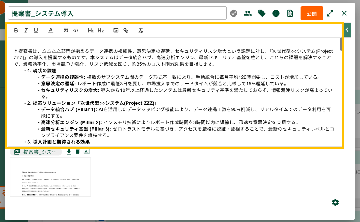 ライトプランでご契約の場合は、「AIファイル要約機能」は実行されず、ファイルのアップロードのみとなります。 - ファイル内データが短い場合や情報が不十分な場合は、要約を生成しない場合があります。