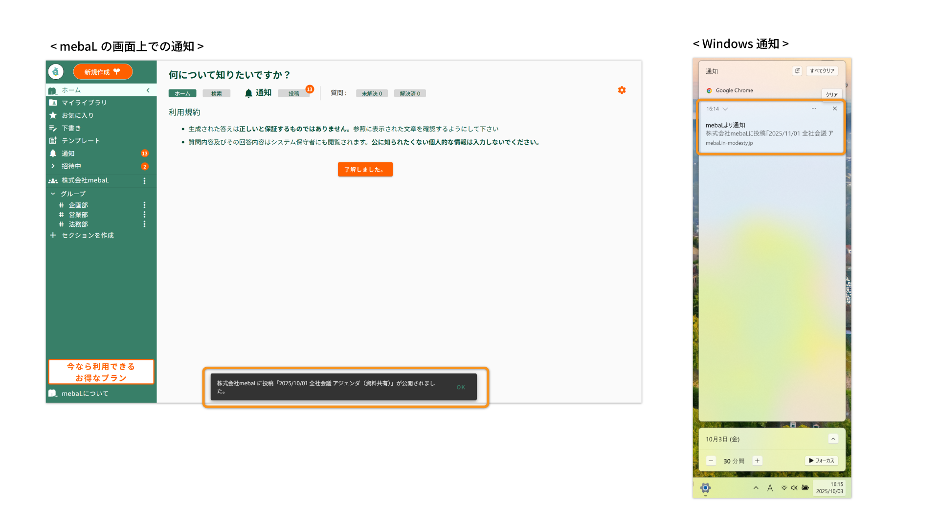 「mebaLの画面上の通知」と「Windows通知」に対応しています。