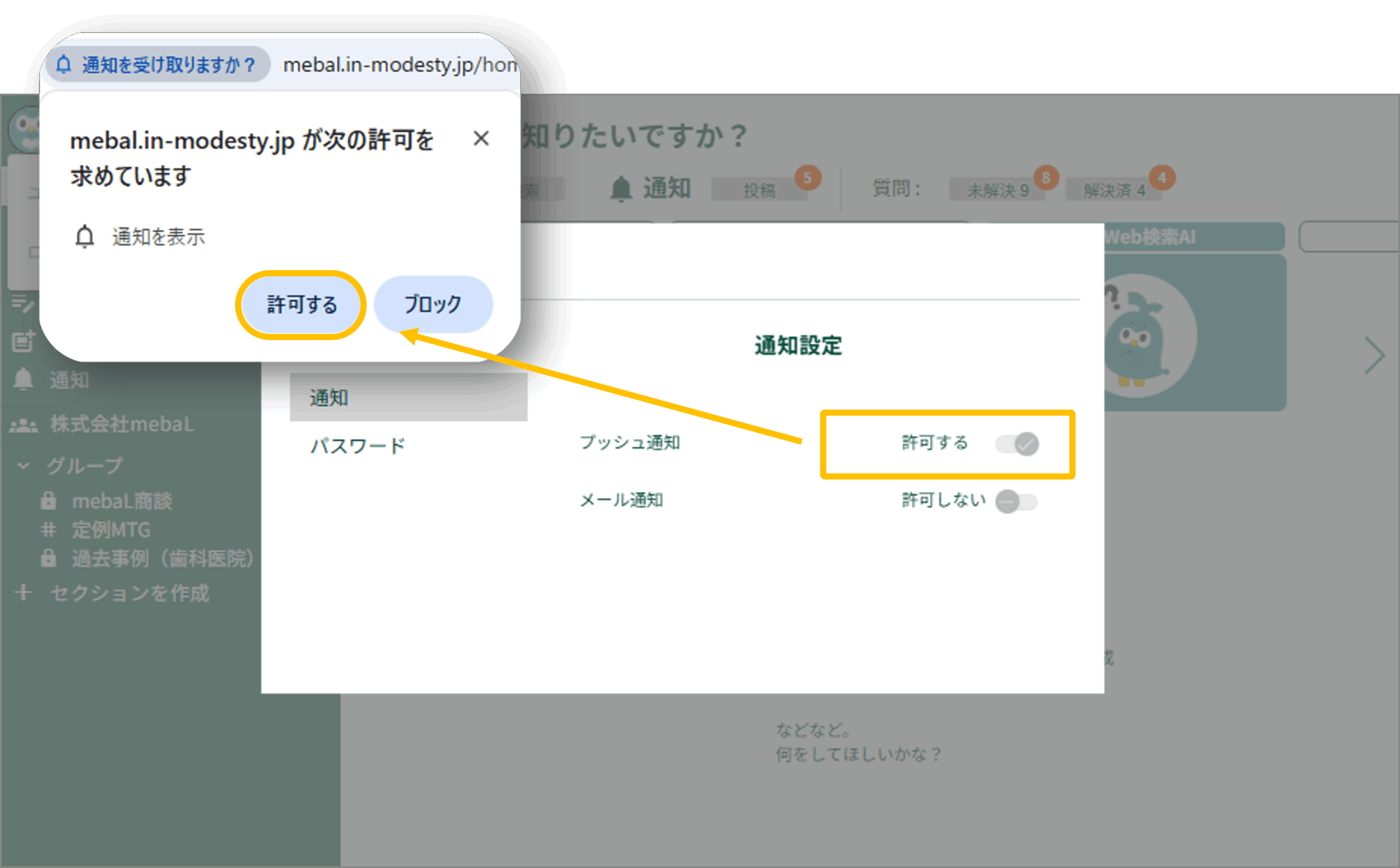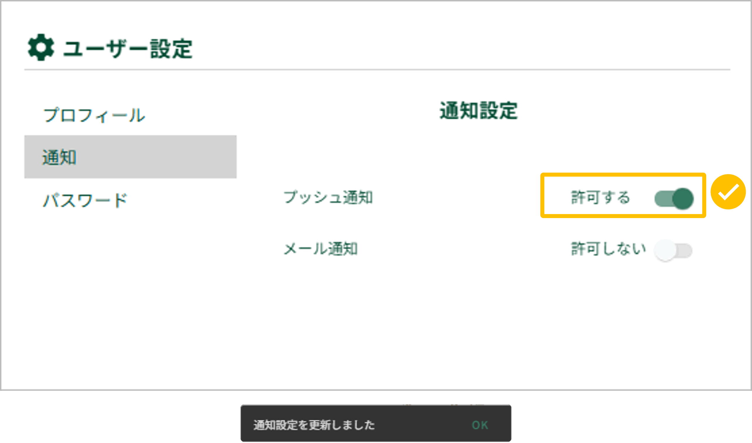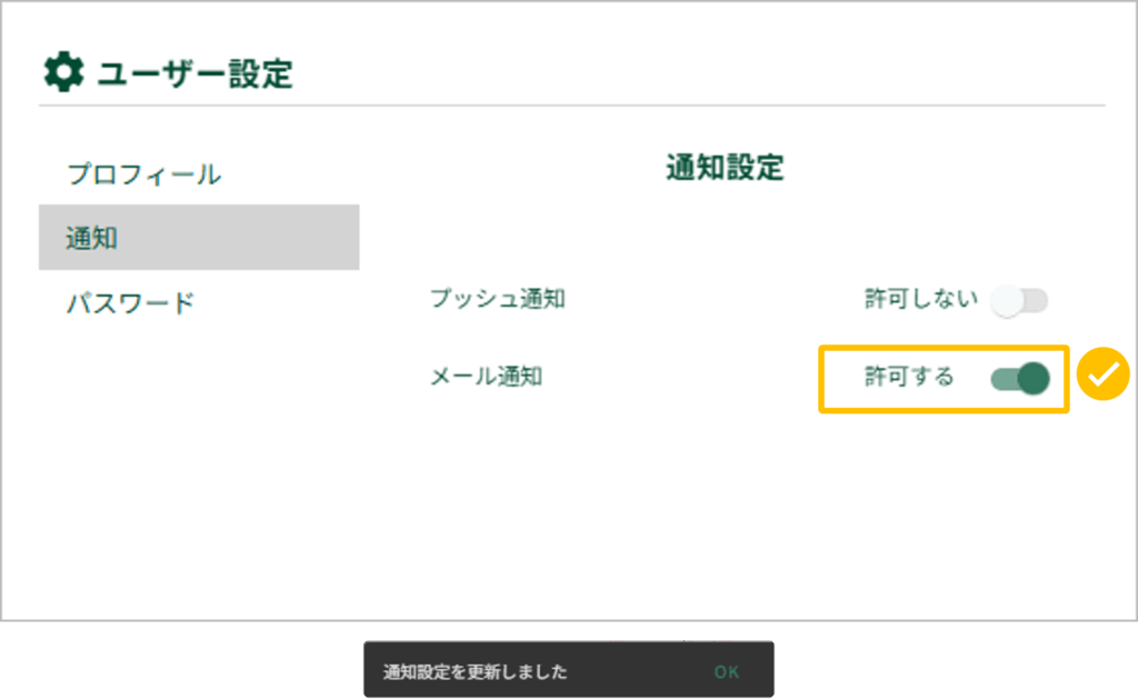2.メール通知を「許可する」にします(トグルボタンをクリックすることでON/OFFが切り替わります)