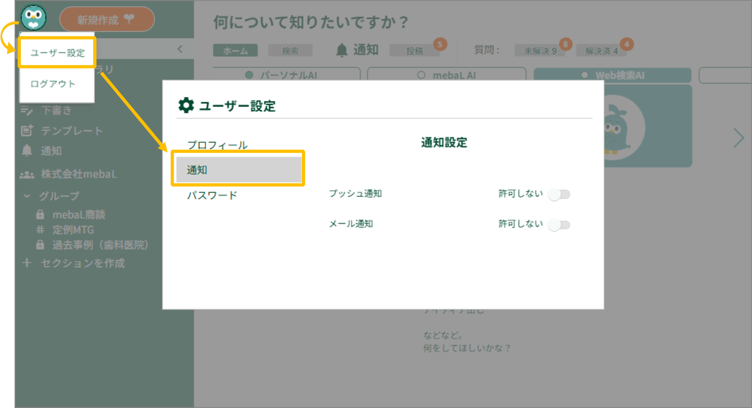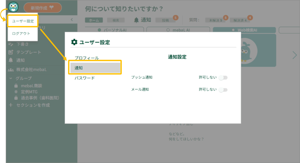 ・プッシュ通知は、mebaLを利用している間、画面上で受け取る通知機能です。