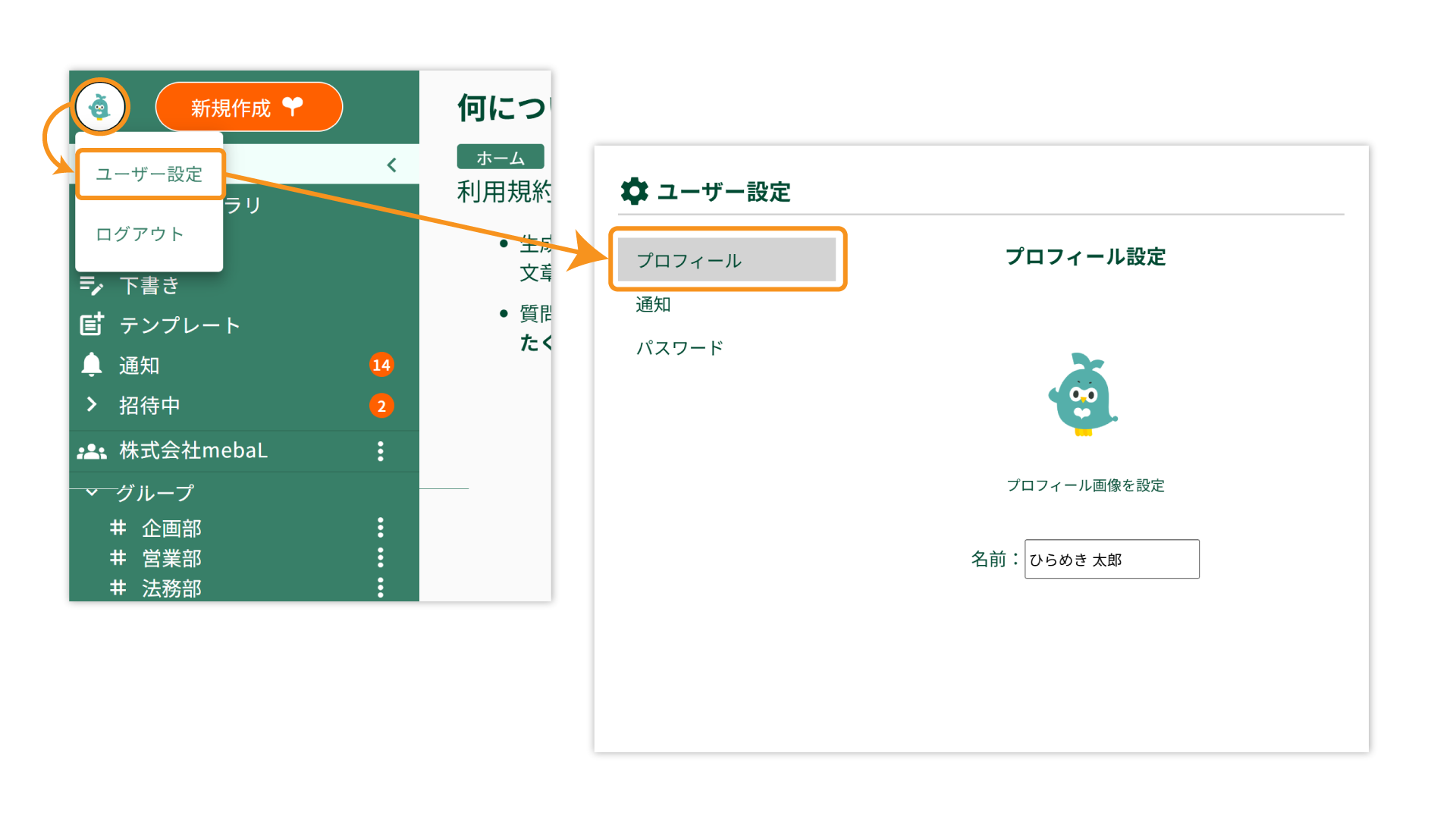 1.画面右上のユーザーアイコン > ユーザー設定画面 > [プロフィール]を開きます。