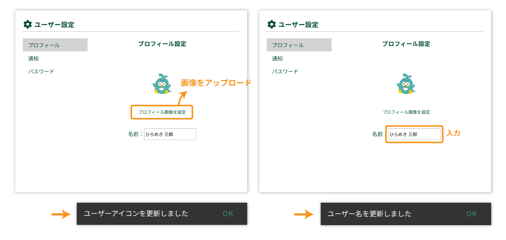 → アップロードが完了すると、「ユーザーアイコンを変更しました」と表示されます。