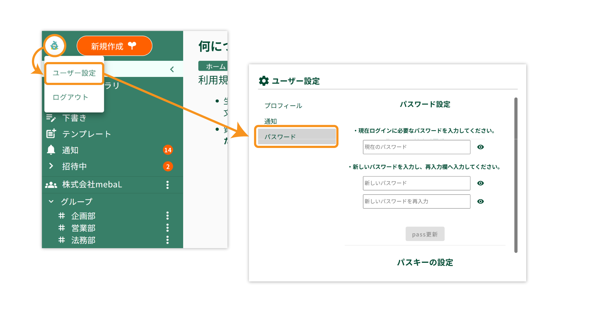 1.画面右上のユーザーアイコン > ユーザー設定画面 > [パスワード]を開きます。