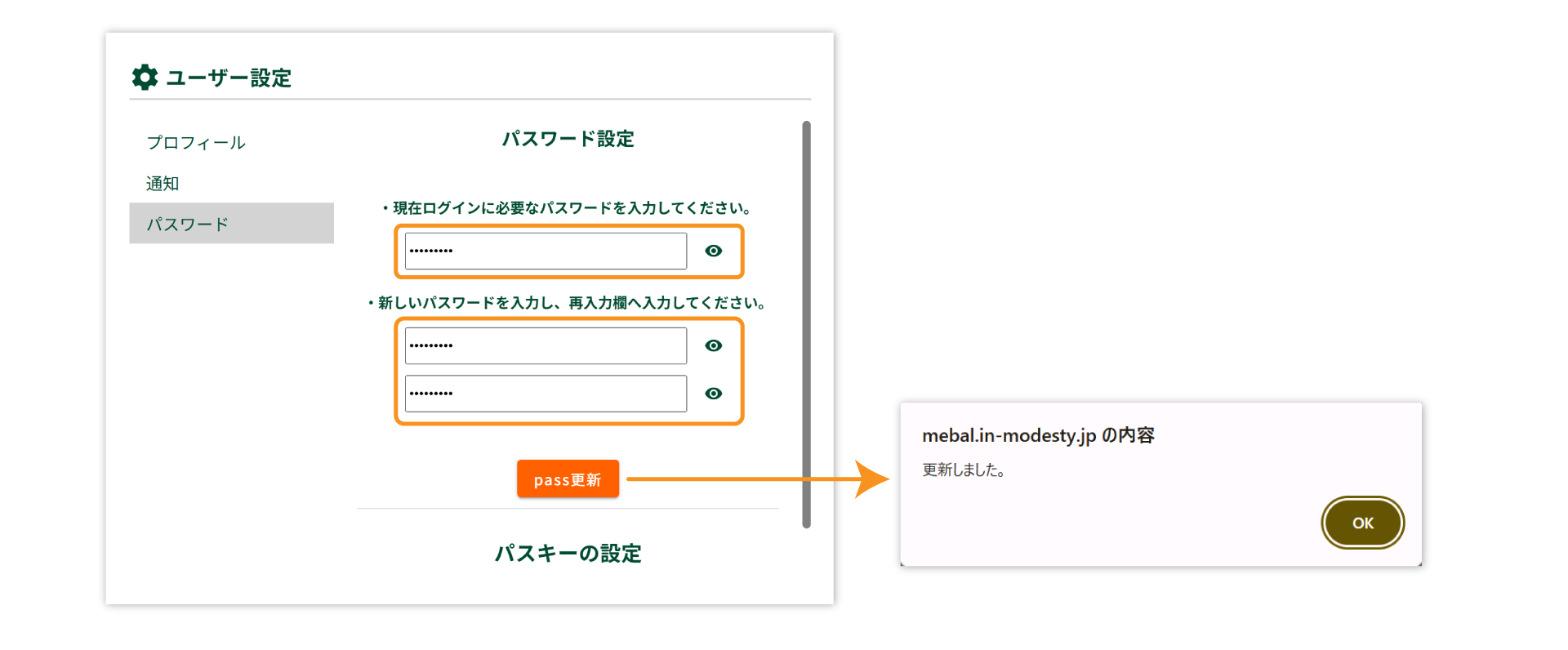 2.現在のパスワードと変更後のパスワードを入力し、「pass更新」ボタンを押下します。