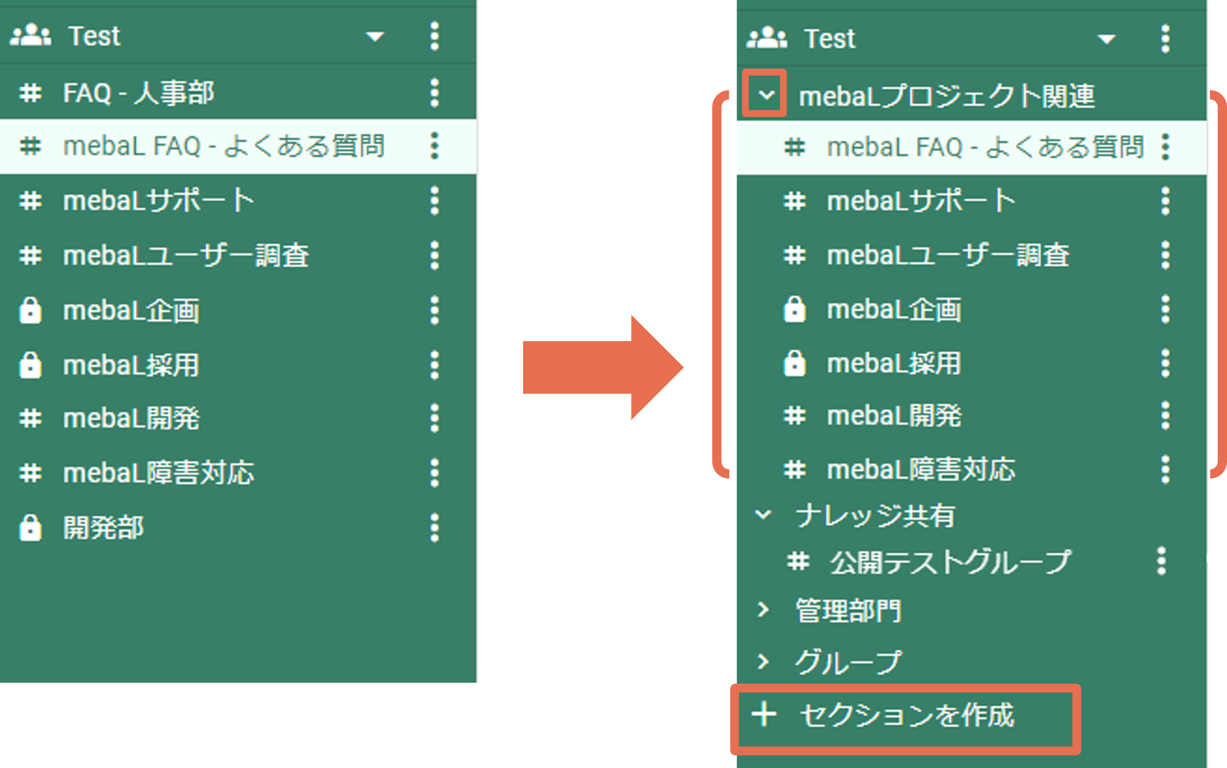 ※セクションもグループ同様に移動・並べ替えができます。