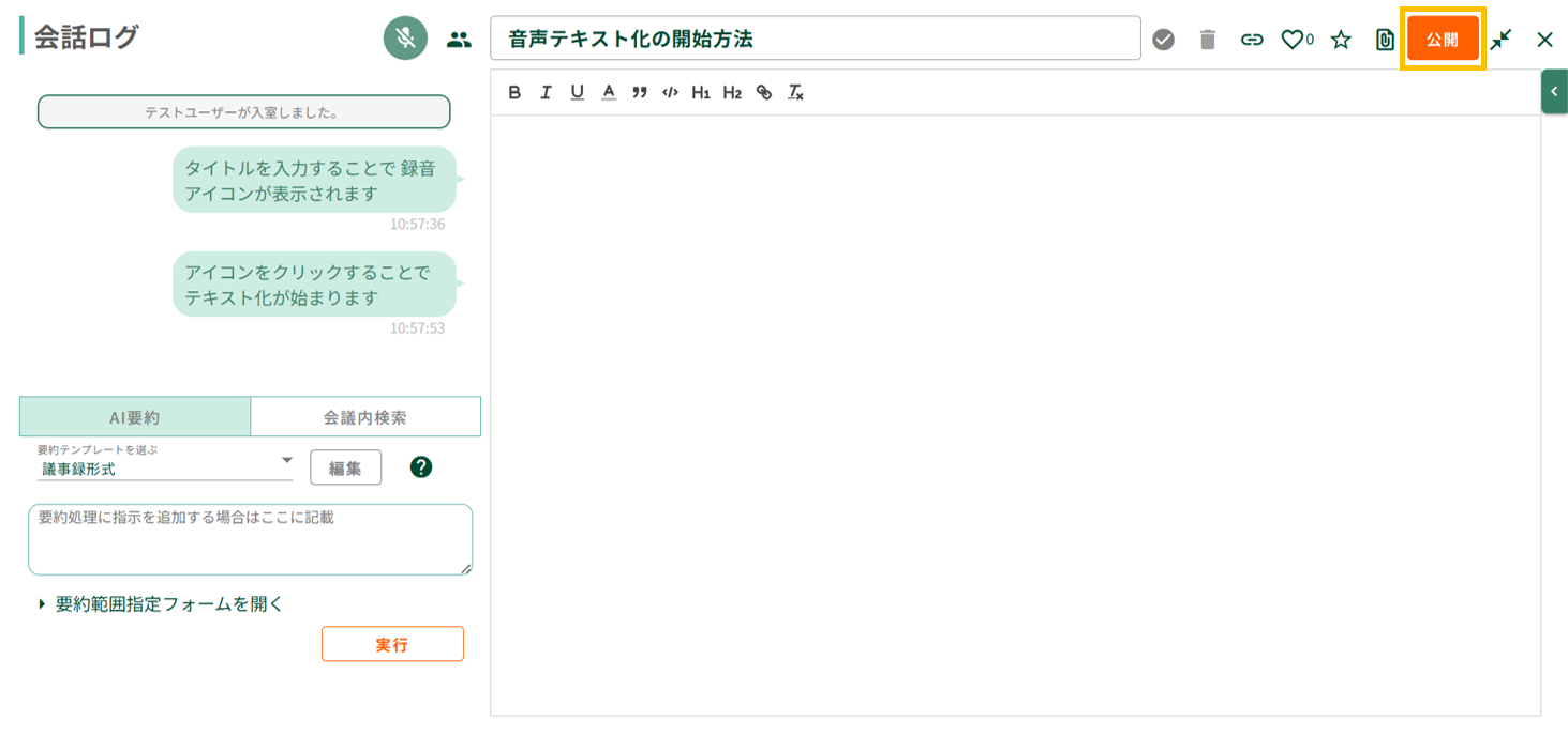 4.録音アイコンを押下することで音声のテキスト化が始まります。もう一度押下するとテキスト化が停止(ミュート)します。