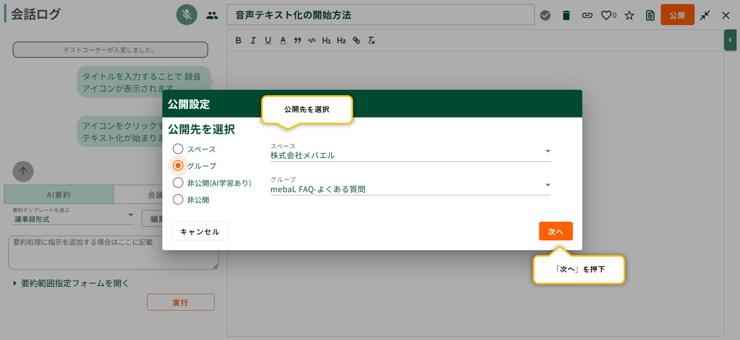 mebaLの音声会議テキスト化機能についてのクイックスタートガイドです。