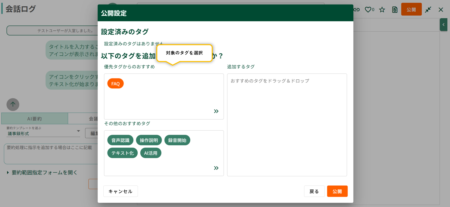3.次の画面で、優先タグとおすすめタグが表示されます。 対象のタグをドラッグ&ドロップ、またはクリックで「追加するタグ」に追加するとタグ付与されます。