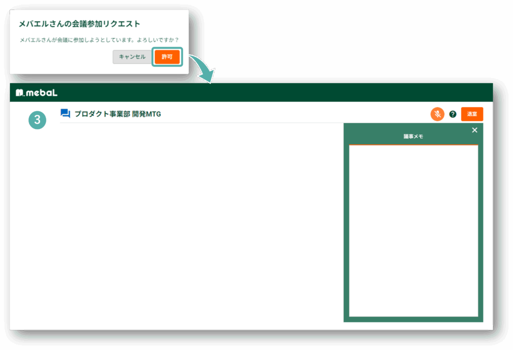 4.招待ゲストからの参加リクエストを受け、会議室に参加許可ダイアログが表示されれば「許可」ボタンが押下します。