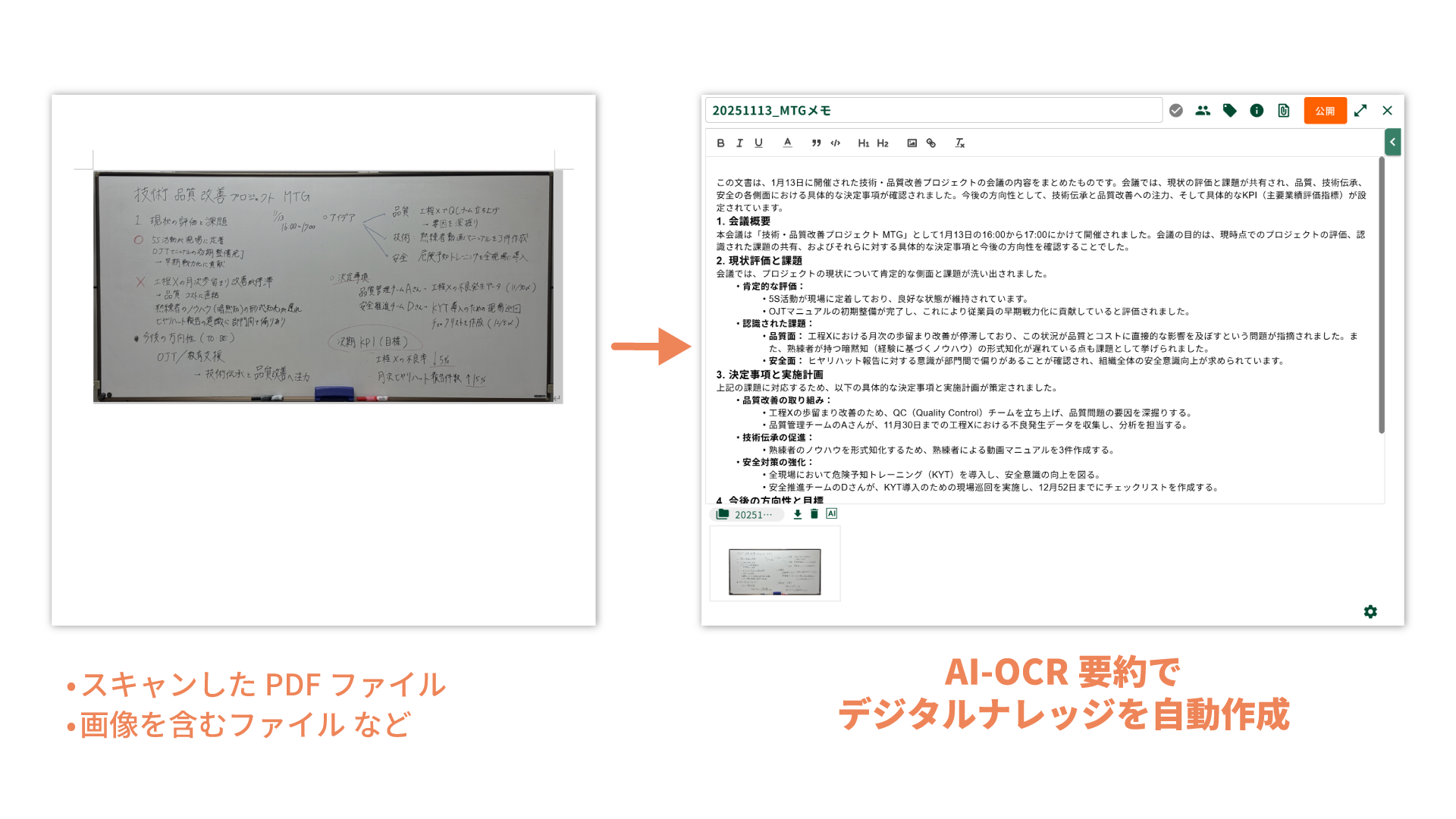 AIファイル要約機能において、紙をスキャンしたデータやホワイトボードの画像を含むデータなどを、AIが自動で読み取りナレッジを自動生成するOCRに対応しました。これにより、今までファイリングされていた資料や、古いマニュアルのPDFなど、活用しづらかった紙ベースの情報をデジタルナレッジとして活用が可能になります。