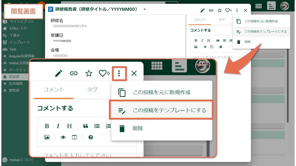 1.テンプレートとして登録したい投稿を表示し、右上の「︙」メニューから「この投稿をテンプレートにする」をクリックします。